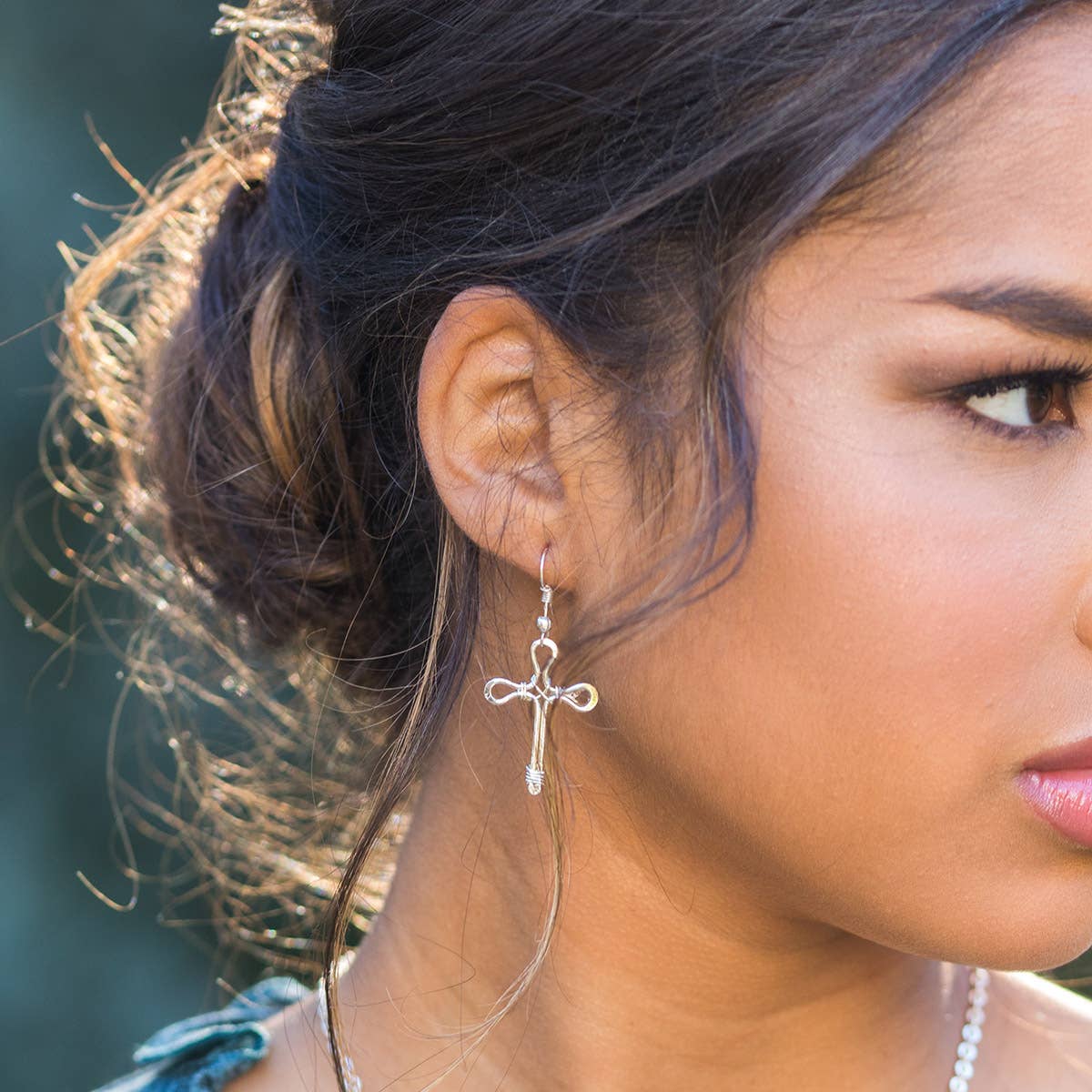 Grace meets craftsmanship in these delicate wire-wrapped cross earrings. Each pair is artisan-made using silver-plated metal, shaped into an elegant cross with sculptural curves and looped detailing. Lightweight yet full of meaning, these earrings are a versatile statement of faith and personal style.